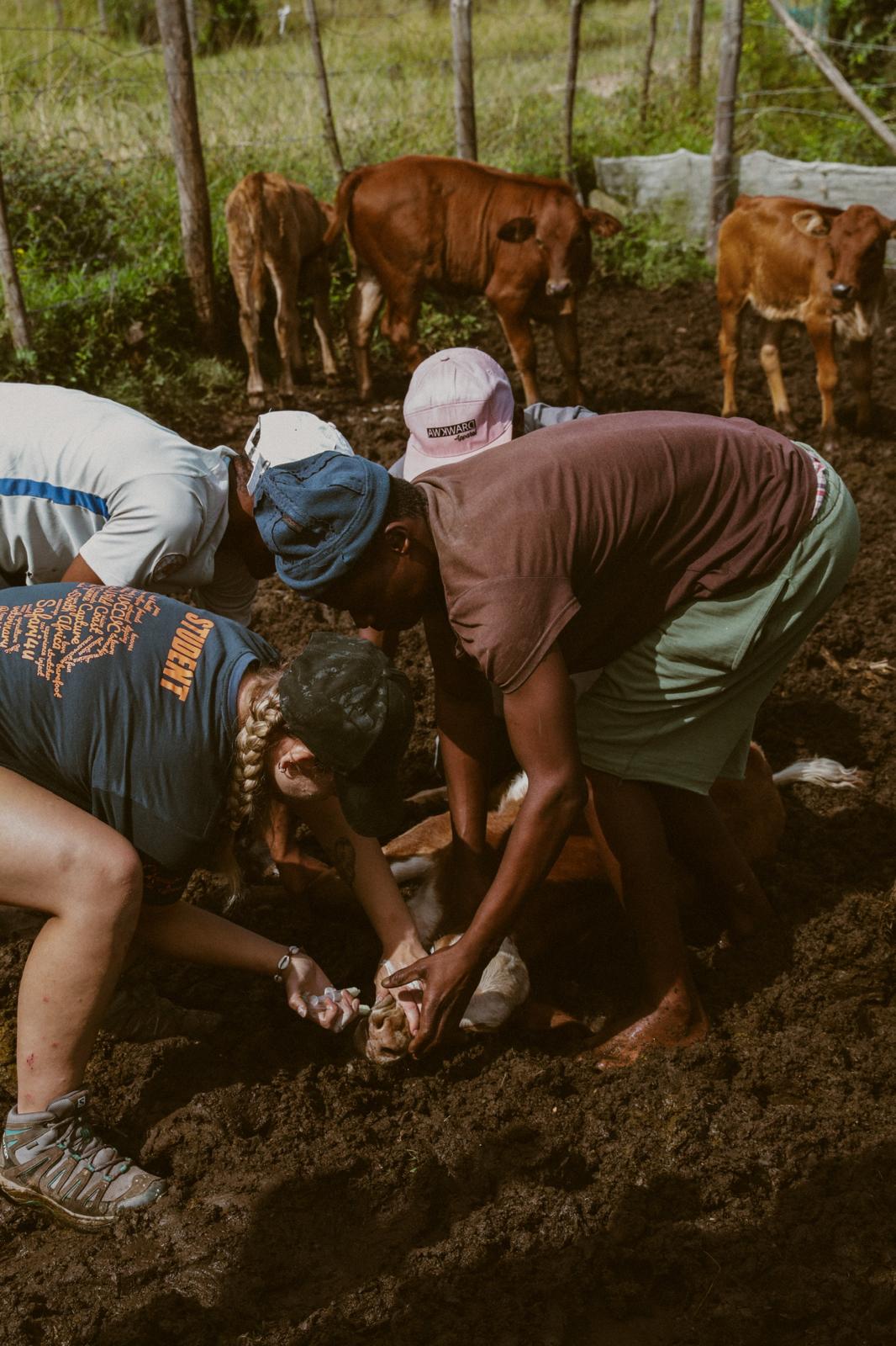 Large Animal Practice covers livestock and farm animal medicine. Work is carried out both on commercial farms and during rural outreach, focusing on cattle (beef and dairy), goats, sheep, pigs, and horses. Activities include parasite control (endo- and ecto-parasites), artificial insemination, and pregnancy testing. Most tasks are completed under the supervision of farmers and qualified staff, with veterinarians involved either through the farmers themselves or directly provided by the program.